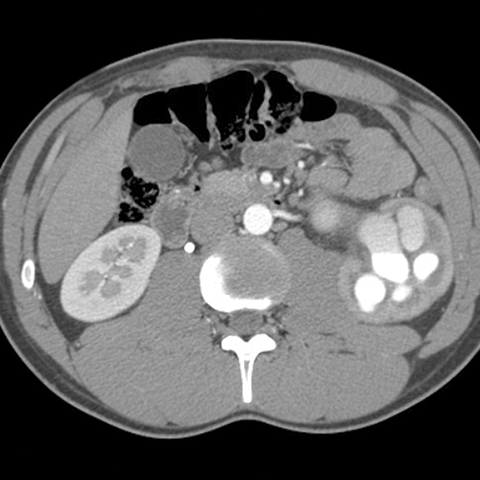 Congenital obstruction of the ureteropelvic junction (UPJ), axial CT [3 of 4]