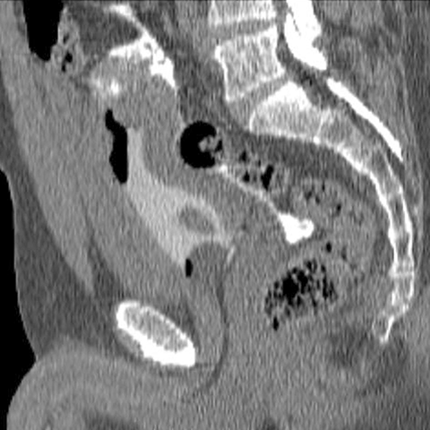 Intraperitoneal rupture of bladder, CT (sagittal) [2 of 2]