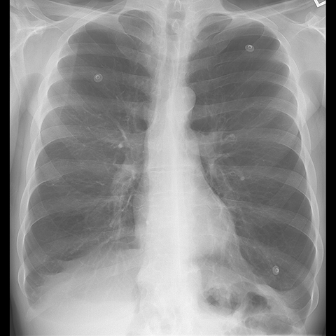 A 62 year-old male presents with chronic shortness of breath (Frontal Radiograph). [1 of 6]